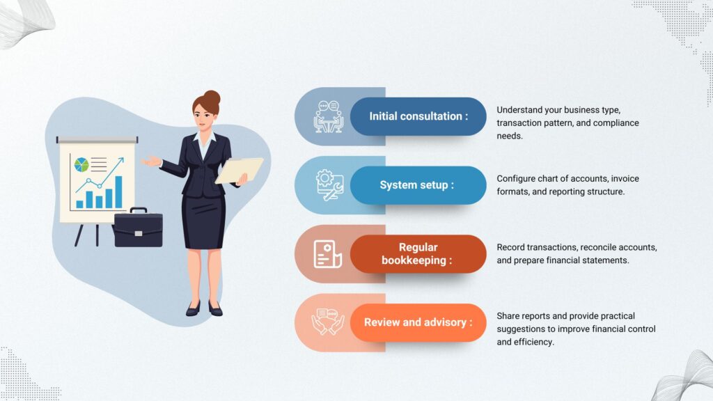 Whether you need full‑time support or periodic assistance, we customise our bookkeeping services in India to match your transaction volume, industry, and budget